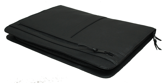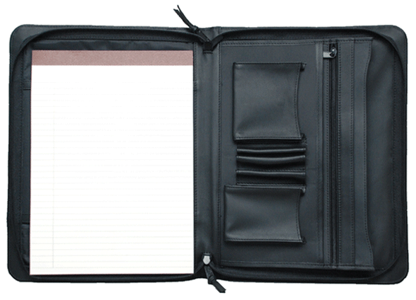 Product Features — Top-grain Napa leather zippered leather cover. Portfolio has a fully-gusseted file pocket. As well as three additional file pockets (one of the three is zippered), pockets for your PDA and cell phone. 3 pen loops (no pens included). 8 1/2 x 11 inches pad holder. For both left-handed or right-handed use. Also, it can accomodate an A4 pad (8.3 x 11.7 inches).