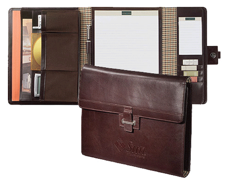 Product Features — Rich color mahogany top-grain leather. Magnetic button flap closure. Tri-fold. Interior organizer includes doucment and accessory pockets for calculators and cell phones. The flap over organizer includes space for notepad and business cards. Includes 8 1/2 x 11 inches perforated writing pad and 3 x 5 inches note pad. Gift box included.
